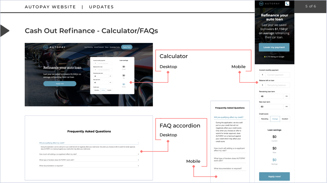 After presenting the final mockups to stakeholders and receiving approval for developers to create the website, we conducted a performance test to compare statistical data from the current and redesigned website. Upon collecting and analyzing the numbers, it was evident that the new website outperformed the original. Bounce rates decreased from 70% to 30%, and engagement increased from 50% to 110%. These results demonstrated that users were able to navigate and understand the website more efficiently, leading to increased engagement and higher rates of refinance application submissions. This successful outcome validated our initial research and ideas, and we were pleased to have created a more effective user experience for our clients.