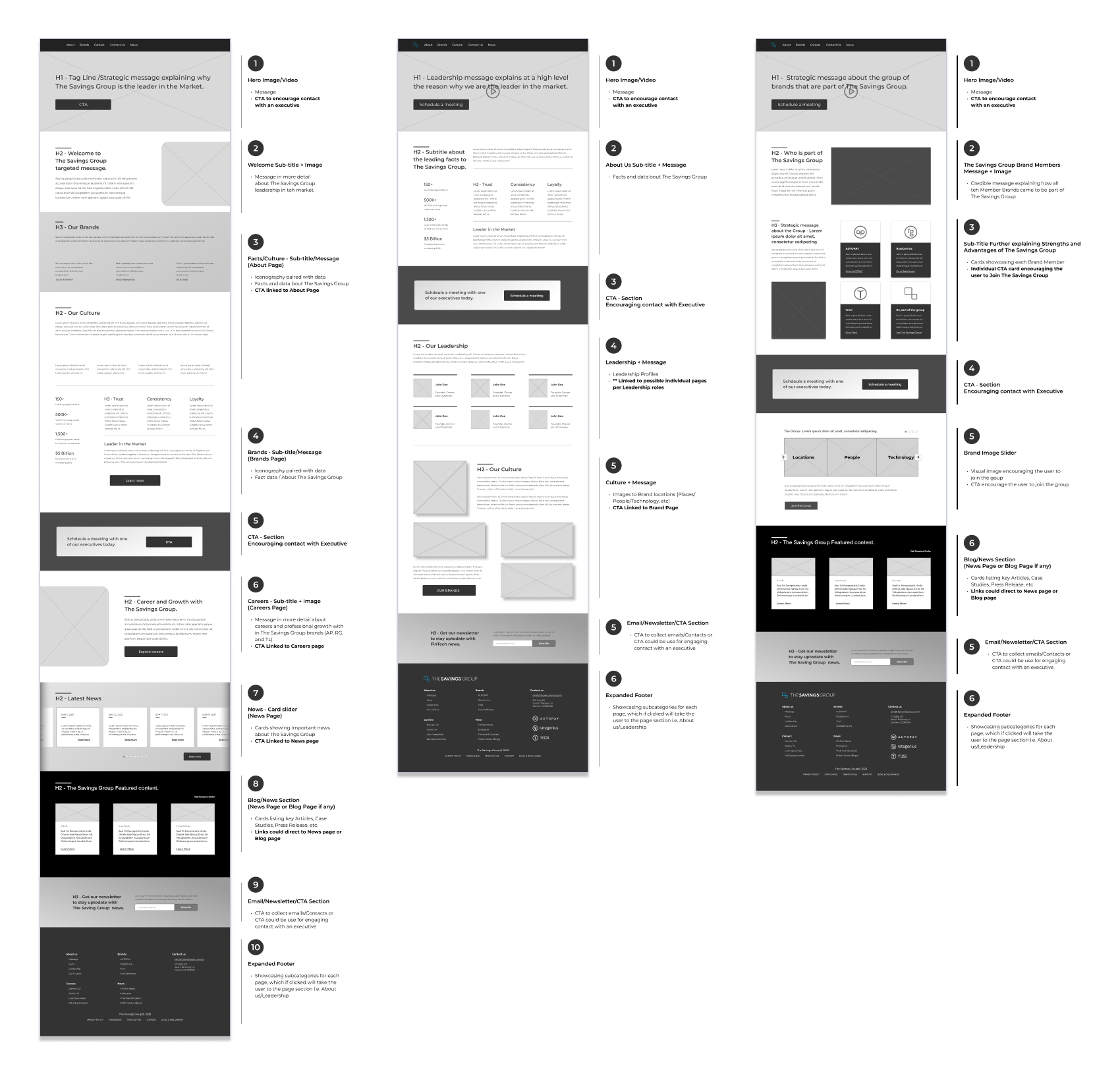 In addition to the interviews, I also performed secondary research, created personas, and conducted a competitive website audit analysis. This analysis involved looking at multiple websites from competitors to understand their approach, with a focus on how they presented information to the user (such as vocabulary, color, layout, and call to action). By combining these insights with the design thinking principles, I was able to develop a comprehensive solution that addressed the needs of both the users and the business goals.