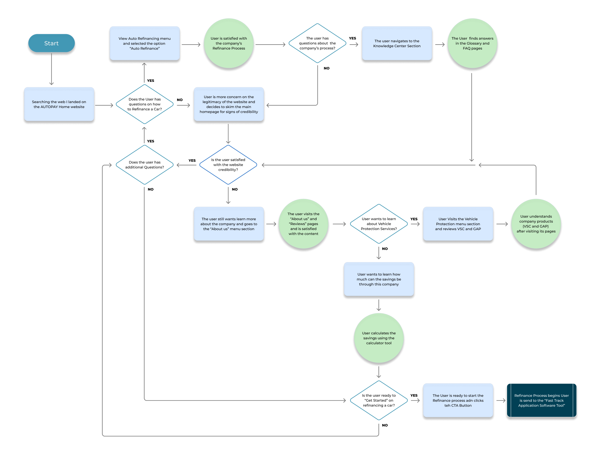 To better understand the needs of the users and the business goals, I conducted a comprehensive research process. First, I interviewed customer service representatives, Fulfillment teams, and managers to gain insights into the challenges they faced. Additionally, I reviewed Quality control recorded calls from actual customers who provided feedback about their experiences with the service and usage of the main website. Through these interviews, I discovered that many users were coming to the website with questions about how to start a refinance process. They were seeking information on the refinance process and also the regular vocabulary used when completing an application. The customer service team also reported challenges with the website's outdated interface, leading to long wait times for customers.