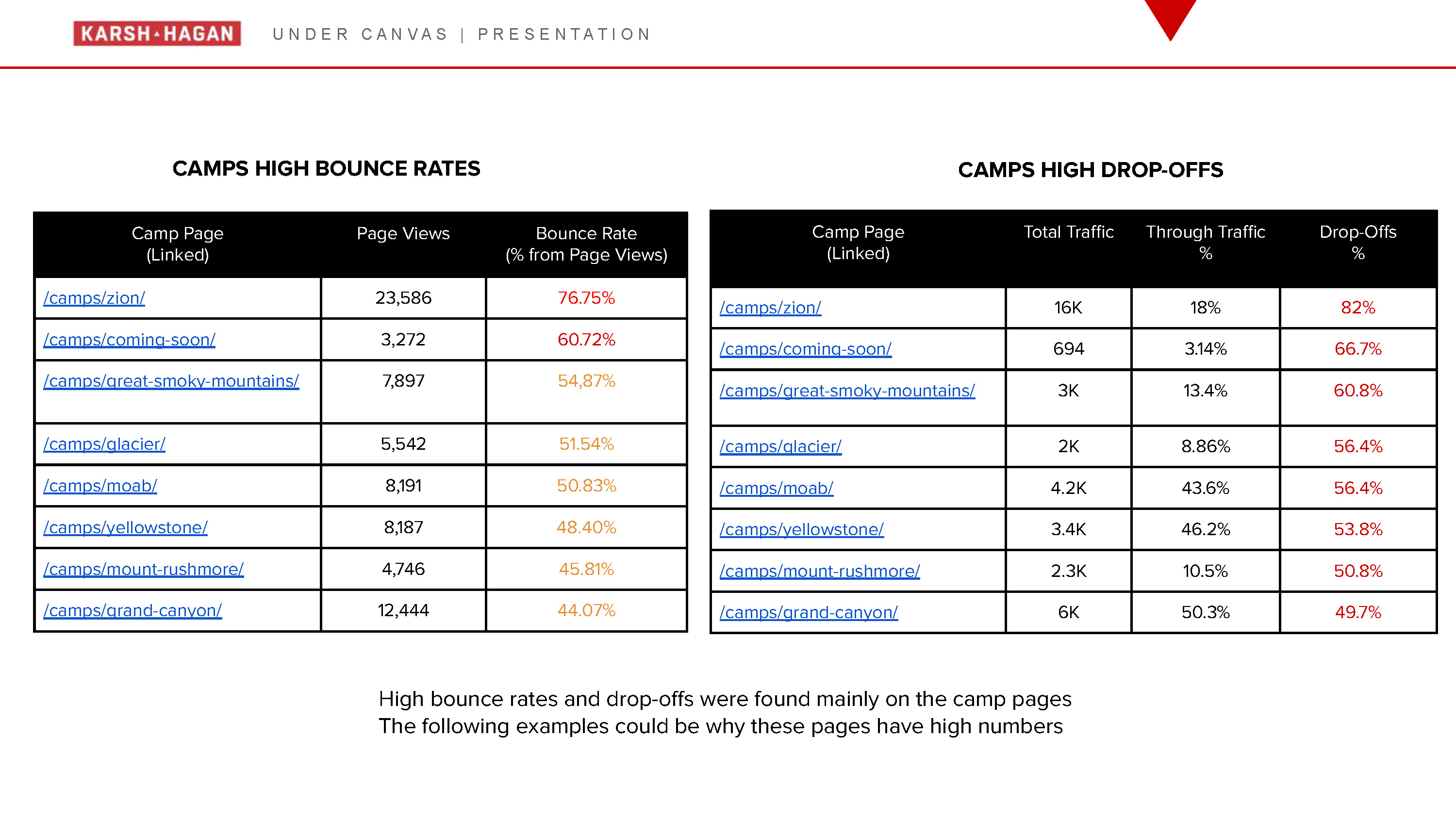 We used Google analytics mainly to look for problematic pages with high bounce rates and Drop-offs. Our main objective was to see if any important pages were experiencing high bounce rates, additionally, we also looked at the page-views so we could see how much interaction these pages were creating. The Drop-off data we collected helped us identify pages where users only looked at a page and were exiting without moving forward to a second page.